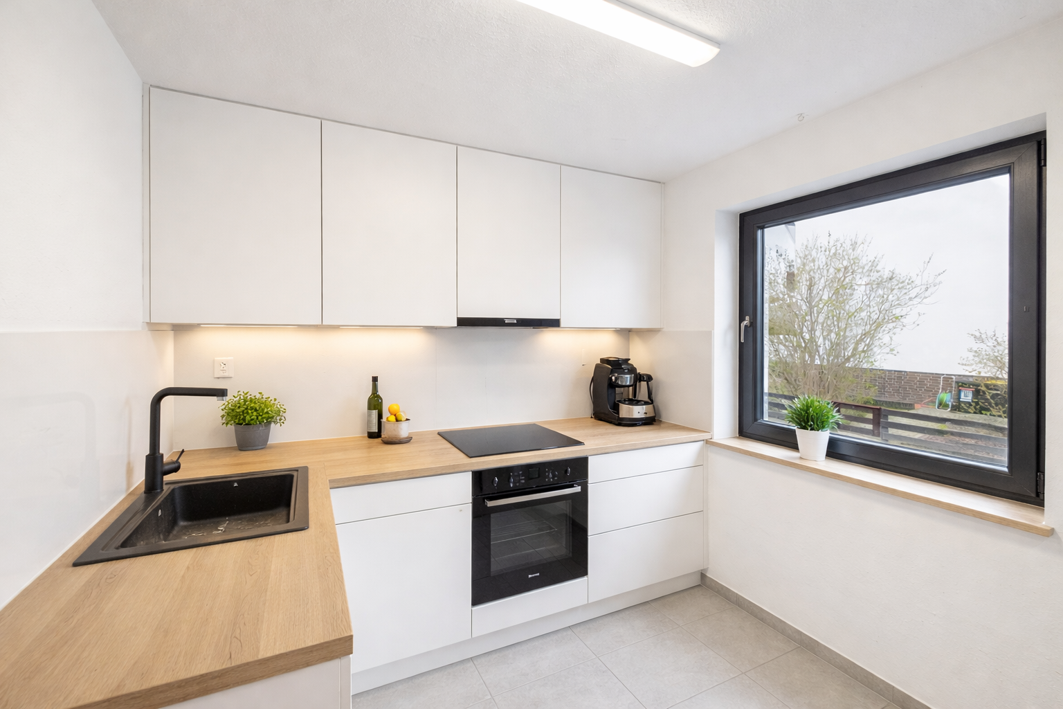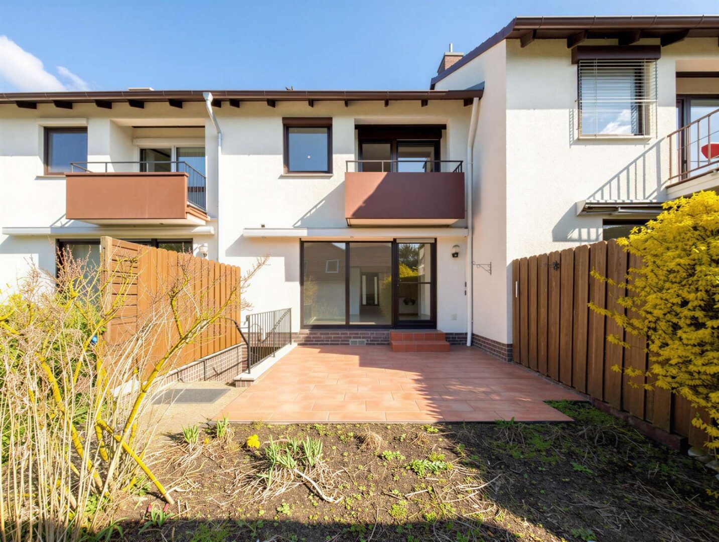 Der großzügige Wohnbereich mit seiner großen Fensterfront bildet das Herzstück des Hauses und bietet direkten Zugang zur Terrasse und in den ca. 80 m² großen Garten mit Südausrichtung. Hier lassen sich sonnige Stunden im Freien in vollen Zügen genießen und ist damit ideal für Familien, Gartenliebhaber oder entspannte Abende. Das gesamte Grundstück umfasst ca. 200 m².