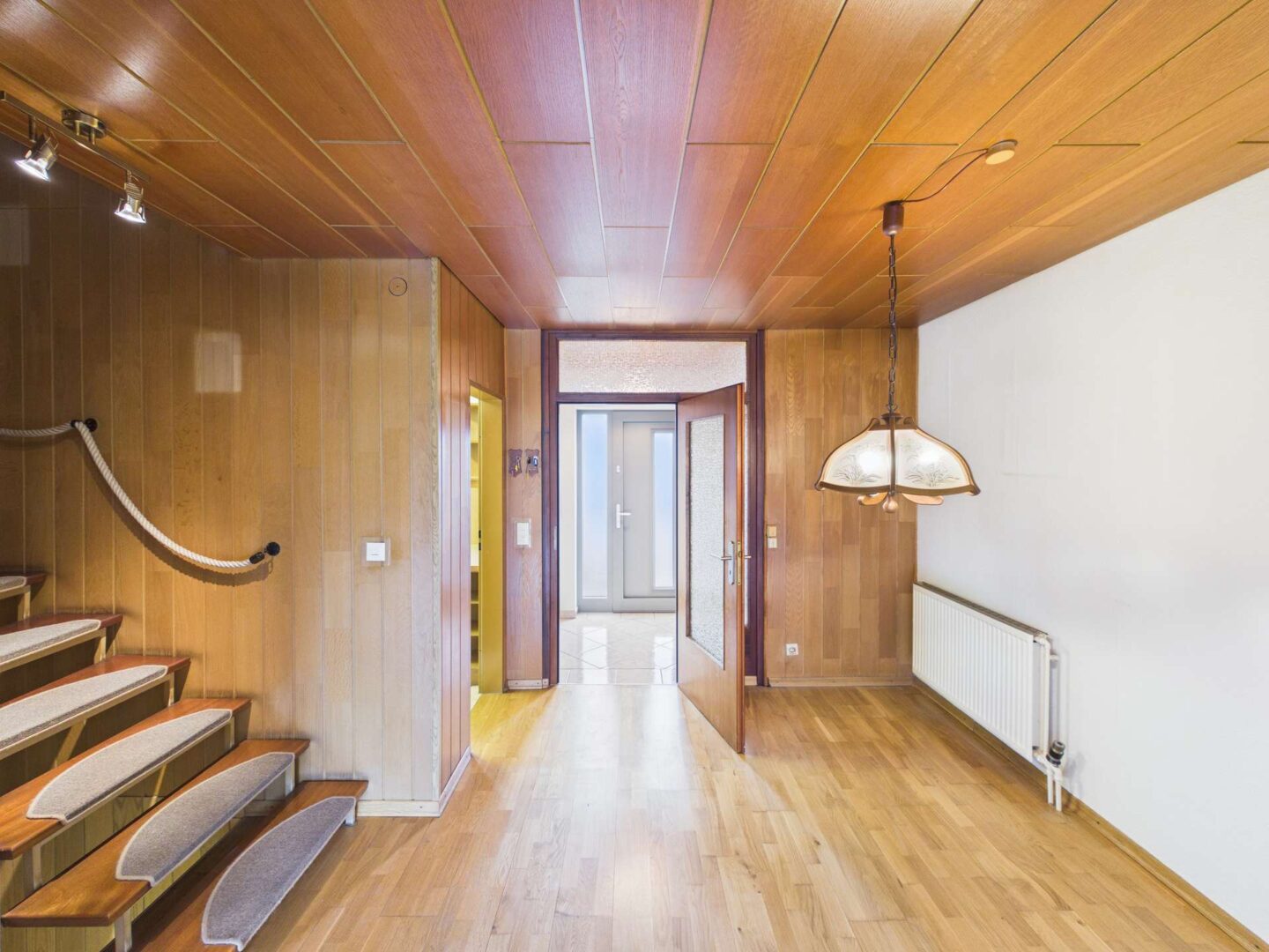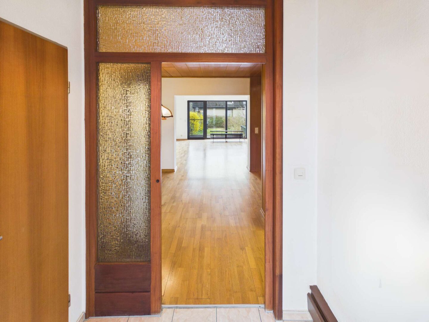 Bereits beim Betreten des Hauses empfängt Sie eine erneuerte Haustür. Dahinter befindet sich ein kleiner, einladender Eingangsflur mit praktischem Gästebad. Im Anschluss gelangen Sie in den offen gestalteten Essbereich, der direkt an das Treppenhaus anschließt. Von hier aus sind sowohl die Küche als auch das Wohnzimmer bequem erreichbar. Das Erdgeschoss überzeugt insgesamt durch seine offene und freundliche Gestaltung.