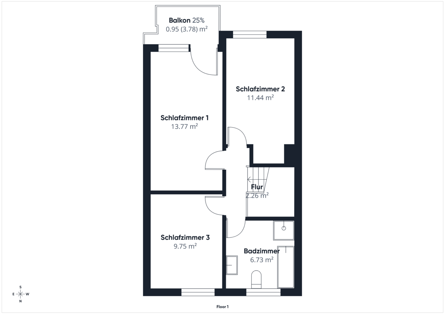 Im ersten Obergeschoss befinden sich drei gut geschnittene Schlafzimmer sowie ein Badezimmer, ausgestattet mit Dusche und Badewanne. Alle Zimmer verfügen über elektrische Rollläden, die zusätzlichen Komfort und Sicherheit bieten.